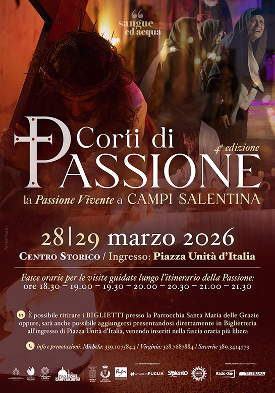 L'evento Corti di Passione, che si terrà a Campi Salentina il 28 e 29 marzo 2026, è una sacra rappresentazione organizzata con il coinvolgimento attivo della comunità locale, che trasforma il centro storico del paese in un teatro a cielo aperto, dove le corti e le vie diventano scenari suggestivi per ripercorrere le tappe della Passione di Cristo. Non una semplice rappresentazione teatrale, ma un vero e proprio percorso di fede itinerante. L'evento si distingue per la sua capacità di coinvolgere il pubblico, che diventa parte integrante della rappresentazione. La musica, i suoni, le luci e i profumi contribuiscono a creare un'esperienza sensoriale completa, che tocca il cuore e l'anima. Campi Salentina, con la sua storia e le sue tradizioni, offre un contesto ideale per questa sacra rappresentazione, che si inserisce nel ricco programma di eventi della Settimana Santa pugliese.